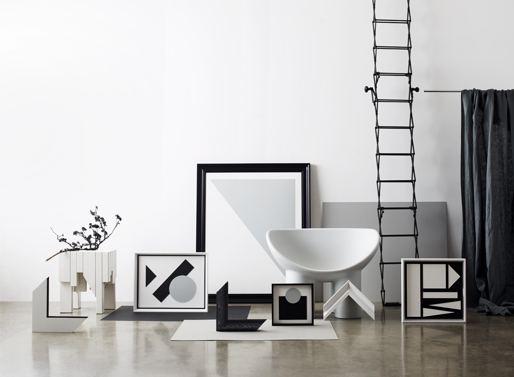 The gorgeous Italian designed curves of the Roly Poly chair and the chunky white angular sidetable by New Zealand designer Timothy John were the perfect pairing. Simple box profiles from our Moda collection sit alongside the bold statement of Noir in black, timeless wedges with slender fillets compliment simple black and white tray frames. Crescent Select matboards in Cubicle, Coconut Milk and Jet Black make up the geometric artworks to finish the look.
